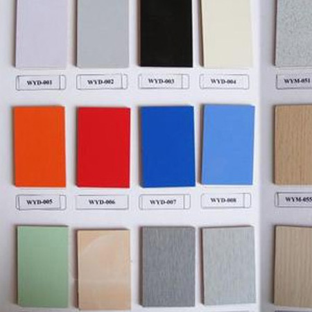 采用多种专用纸张经酚醛、三聚氰胺、树脂处理、高温高压而成的热固性树脂装饰层压板,它不仅颜色鲜艳、光亮平整、而且具有耐磨、耐热、无污染、可清洗及永久性装饰的功能,标准厚度有0.8mm、1.0mm、1.2mm、1.5mm、1.6mm,其厚度可根据用户需求定制。